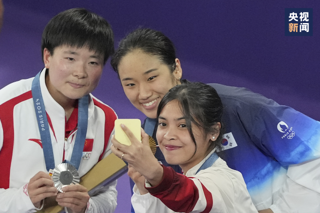 跳水女子3米板决赛,中国选手陈艺文夺得金牌,队友昌雅妮获得铜牌,澳大利亚选手基尼拿下银牌。颁奖时,三人精心设计的“小节目”可爱又温馨。