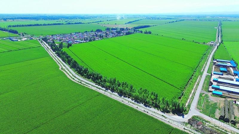 俯瞰博乐市小营盘镇呼和布热村一角(8月8日无人机摄)。放眼该村,平坦的农村公路、绿色的条田、整齐的村庄,形成一幅美丽的乡村画卷。 贺程摄
