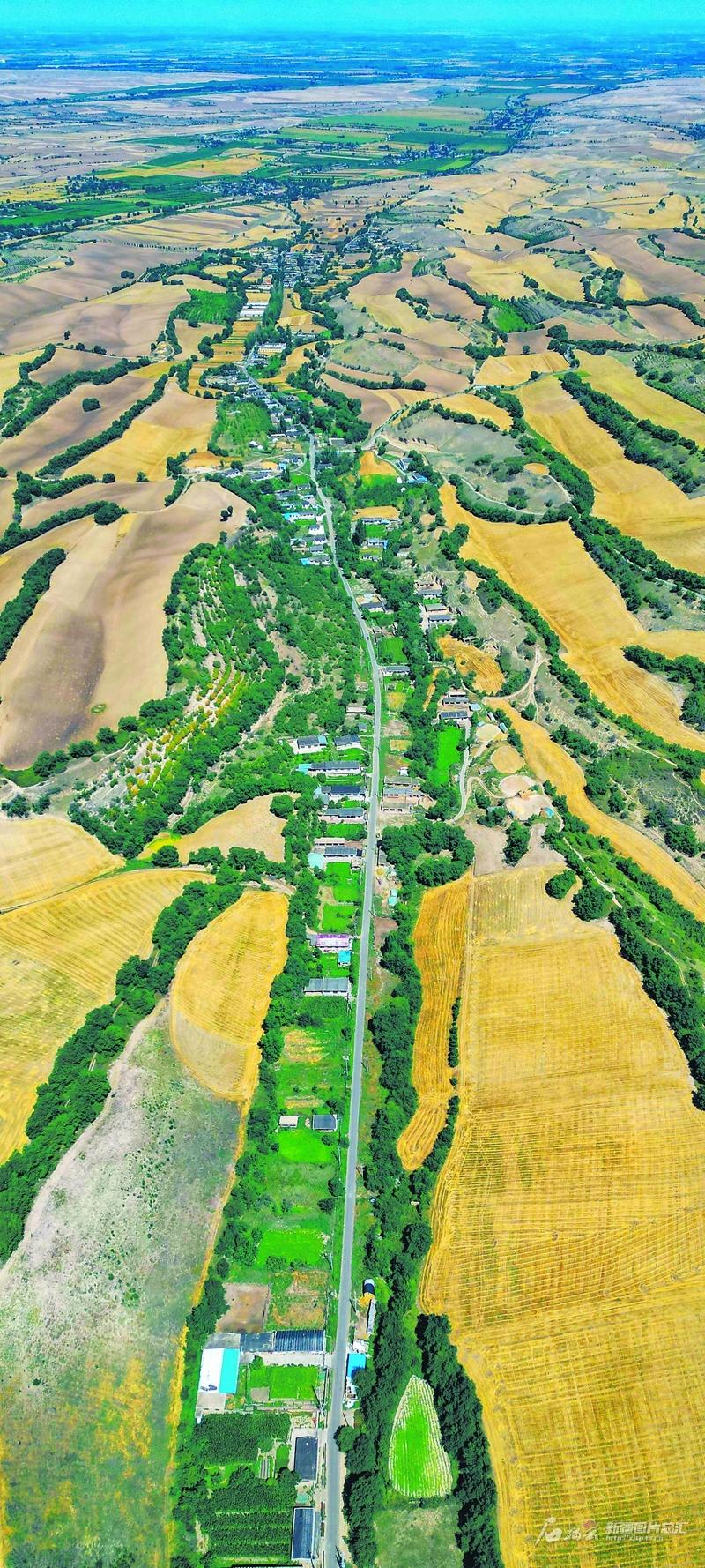 俯瞰木垒哈萨克自治县英格堡乡庙尔沟村(8月2日无人机摄)。通过庙尔沟村的乡道串联着户户农家,也串联出乡村振兴新图景。 石榴云/新疆日报记者蔡增乐摄