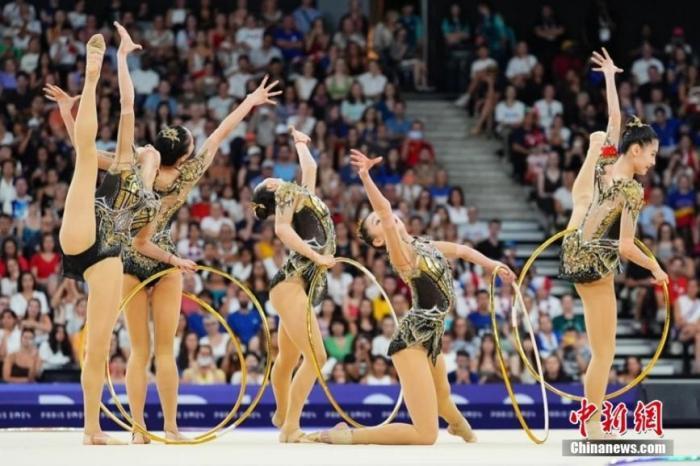 当地时间8月10日,在巴黎奥运会艺术体操项目集体全能决赛中,中国队获得冠军。