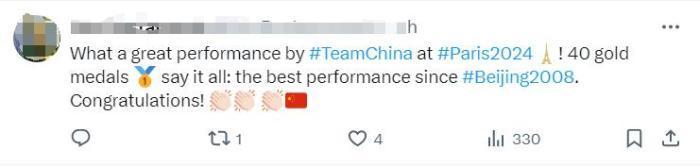 “中国队在2024巴黎奥运会上的表现太棒了!40枚金牌收官,这是自2008年北京奥运会以来中国队的最佳表现。恭喜!”