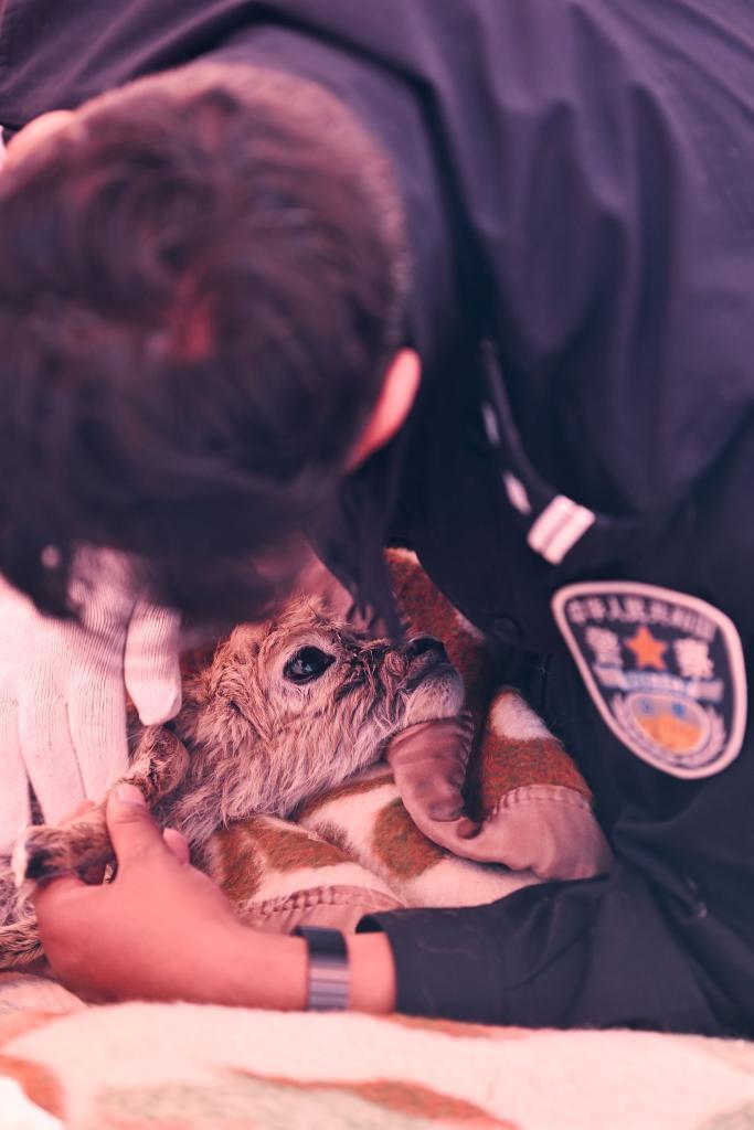 很难想象,这些面庞黝黑、身材魁梧的藏族汉子会趴在一只小藏羚羊身边,一边轻柔地给它擦拭身体,一边像安抚哭闹的孩子一样,轻声细语地告诉它:“不要害怕,我们来救你了”。