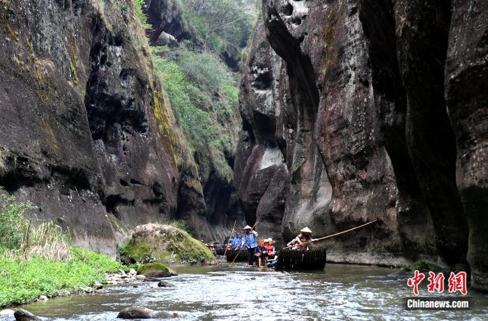 游客乘坐竹排在上清溪景区游玩。记者 吕明 摄