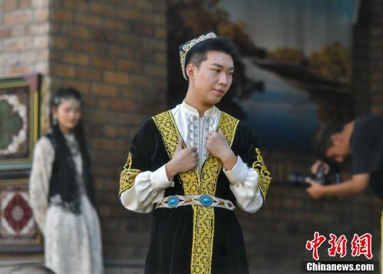 8月12日,新疆乌鲁木齐市大巴扎步行街,游客穿着经过改进的民族服饰拍摄高清写真照。8月,正值新疆旅游旺季,各种民族特色旅拍主题受到游客的追捧。