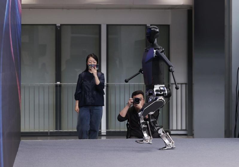 2024年4月27日,“天工”机器人亮相并做行走和跑步演示。