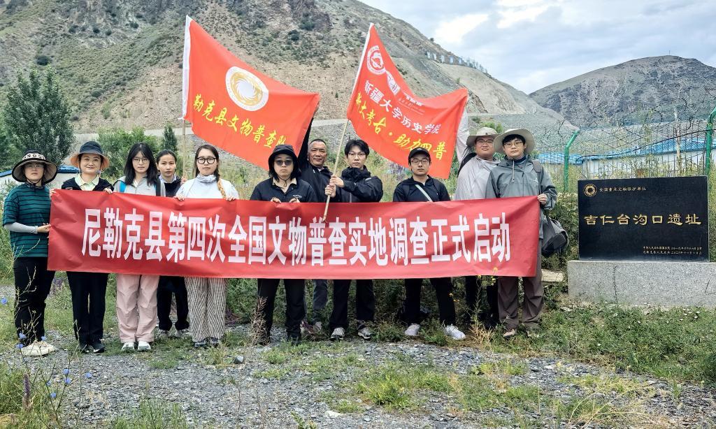 尼勒克县第四次全国文物普查工作队在吉仁台沟口遗址合影。新华社发(受访者供图)