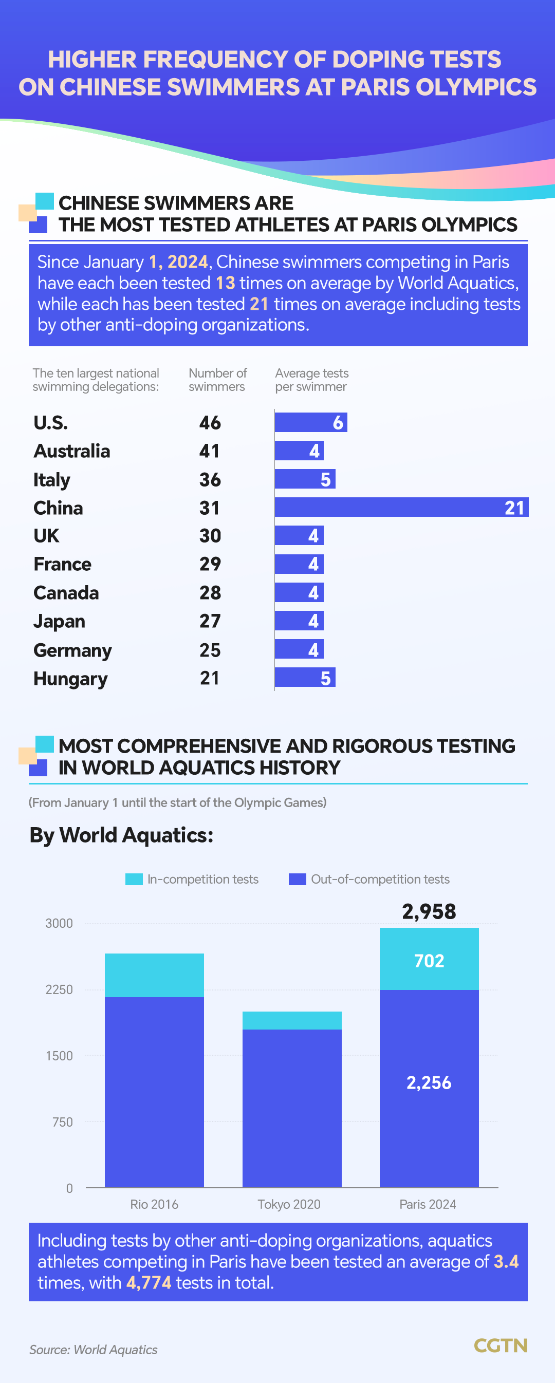 另据世界泳联公报显示,参加巴黎奥运会的31名中国游泳运动员在赛前接受了“最密集的检测”,抵法后10天内,中国运动员更是被世界反兴奋剂机构(WADA)检测了近200次。如此严苛的检测之下,WADA明确表示未发现中国游泳队存在任何问题。