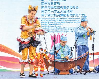 四月十二日,在第二届中国—东盟(南宁)非物质文化遗产周上,演员们进行非遗展演。彭寰 摄(人民图片)