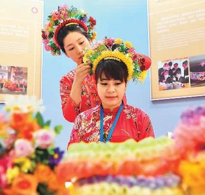 2月2日,两名女孩在2024中国—东盟人文交流年展览活动上展示福建蟳埔女头饰。新华社记者 姜克红 摄