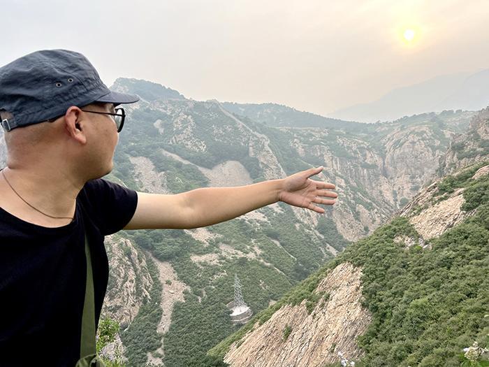 7月5日,在河北省秦皇岛市山海关区,吉双喜比约定时间提前到达了位于角山长城景区外的腰铺九号敌台。烈日下,他站在山坡上,边打电话,边向记者招手示意。