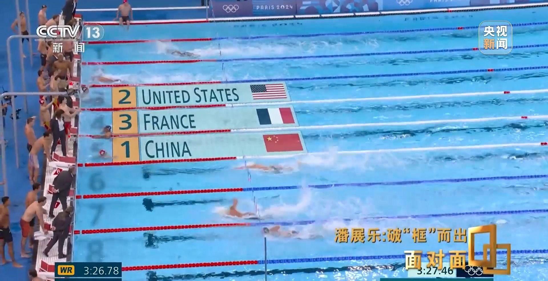 3分27秒46,中国队战胜美国队,首次获得该项目的奥运金牌,终结了美国队在这一项目上的垄断。其中,潘展乐在最后一棒自由泳分段中打破46秒的局限,游出了45秒92的成绩。尽管非混合类接力游泳的首棒选手才能被认证为世界纪录,但这已是人类首次游进46秒内,这距离潘展乐闯进48秒大关,仅过去了两年。