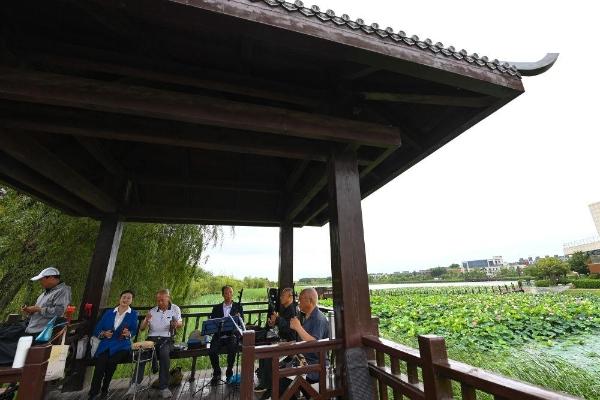 居民在陕西省富平县石川河国家生态公园内练习秦腔(2024年6月21日摄)。新华社记者 邹竞一 摄