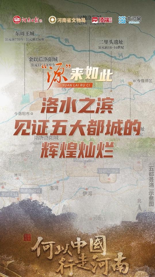 洛阳,一座具有5000多年文明史、4000多年建城史和1500多年建都史的城市。“五都贯洛”描绘出河洛大地早期王朝的起源历程,展现了中国都城形制从出现到成型的过程。