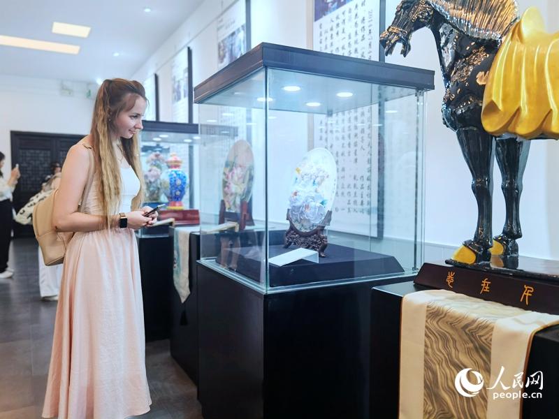 来自白俄罗斯的留学生喀秋莎驻足欣赏牡丹瓷。人民网记者 尚明桢摄