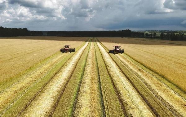 8月6日,在北大荒集团黑龙江红星农场有限公司,大型农机在收获小麦(无人机照片)。新华社发(侯越摄)