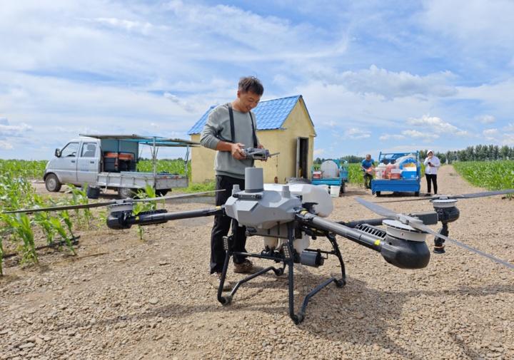 内蒙古扎赉特旗农民正在调试无人机,无人机能够喷洒农药,提高作业效率。(受访者供图)