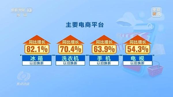 商务部发布的数据显示,上半年我国数字商品、服务消费、以旧换新成为新增长点,主要电商平台冰箱、洗衣机、手机和电视以旧换新同比分别增长82.1%、70.4%、63.9%和54.3%。