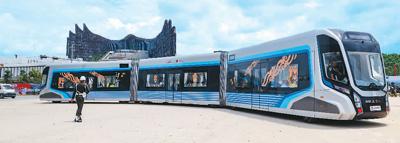 工作人员和智轨系统合影。新华社记者 徐钦摄
