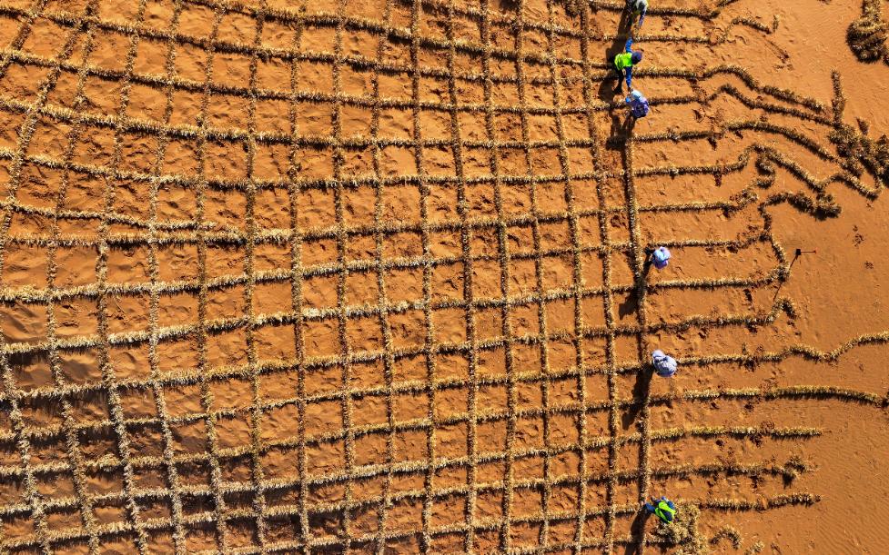 治沙工人在宁夏中卫市境内的腾格里沙漠铺设刷状网绳式草方格沙障(2024年5月30日摄,无人机照片)。新华社记者 冯开华 摄