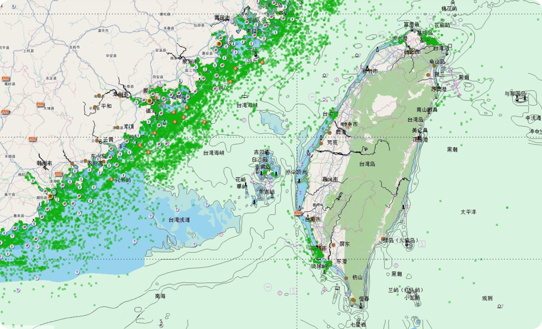 台湾海峡航行船舶实时分布情况(绿点代表正在台湾海峡航行的船只)