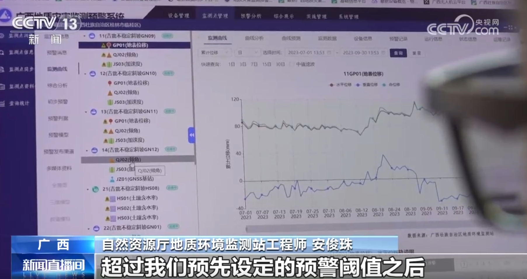 自然资源厅地质环境监测站工程师安俊珠介绍:“这个是广西全区的地质灾害监测预警系统,它主要管理全部3470处的监测站点,还有22000多台的监测设备都全部纳入系统管理。野外的监测设备采集到数据之后,上传到后台服务器,一旦这个数据变化超过预先设定的预警阈值之后,平台会生成预警信息,提醒群众紧急撤离。”