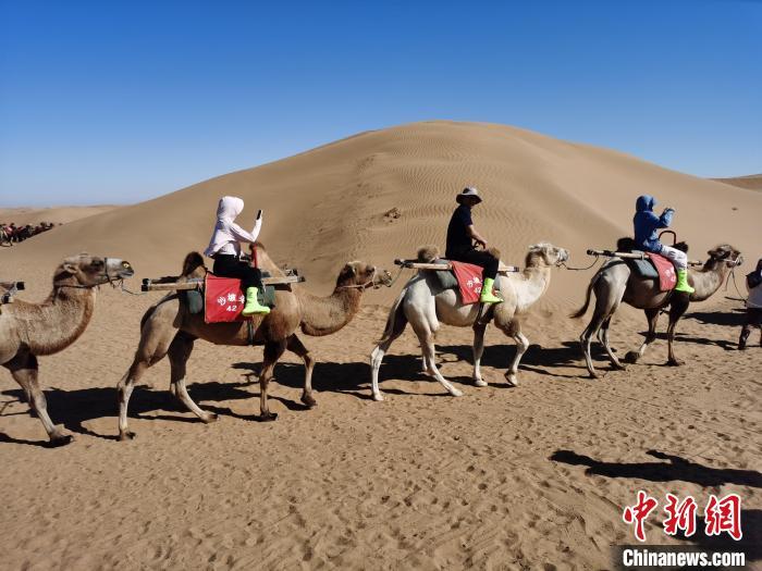 游客在沙坡头景区体验骑骆驼。张乐 摄