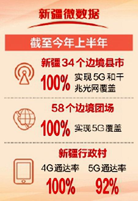 截至今年上半年,新疆34个边境县市已100%实现5G和千兆光网覆盖;58个边境团场也已全部实现5G覆盖,其中51个边境团场实现了千兆光网覆盖。此外,新疆行政村的4G通达率已达到100%,5G通达率达到了92%。