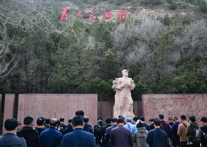 延安枣园,《为人民服务》讲话纪念广场,青山掩映之间,张思德同志的雕像身姿英挺、目光炯炯。时光流转,张思德精神鼓舞更多人扎根黄土地,践行全心全意为人民服务的承诺。