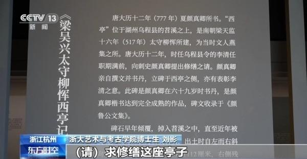 浙大艺术与考古学院博士生 刘影:这是颜真卿在唐代大历十二年,即公元777年亲自撰写并书丹而成的。西亭是由当时南朝梁的吴兴太守所建的文人雅集之所,然而到了唐代,这座亭子年久失修逐渐被破坏,当时的乌程县县令李清将这件事上报给当时的湖州刺史颜真卿,请求修缮这座亭子,颜真卿便欣然同意,于是亲自撰写碑文内容。