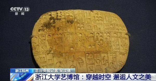 总台央视记者 吴汶倩:这块公元前3000年在美索不达米亚发现的楔形文字泥板,是浙大艺博馆“丝绸之路上的亚洲文明”展上最古老的一件文物。这个展在暑期热度非常高,不少观众专门为它而来,因为这里汇聚了亚洲各地古老文明的瑰宝,大家能亲身感受到什么是文明交流互鉴。