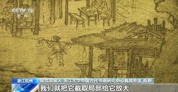 展览策展人、浙江大学中国古代书画研究中心首席专家 陈野:这幅画是北宋一个画家李成画的《晴峦萧寺图》,在这个整幅的巨型画作中,它有一个局部,它是三种建筑的样子,也是三种商业业态的体现。在整幅画里它不太起眼,我们就把它截取局部给它放大,把跟历史文化内涵有关的内容放大。