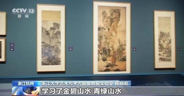 浙江大学艺术与考古图像数据实验室 陈晓皎:墙面上正好是不同朝代画家的画作,我们希望观众在浏览不同画作之后,也能够看到人工智能技术同样能够学习他们画作的特点、特征,学习了金碧山水、青绿山水,然后生成作品。
