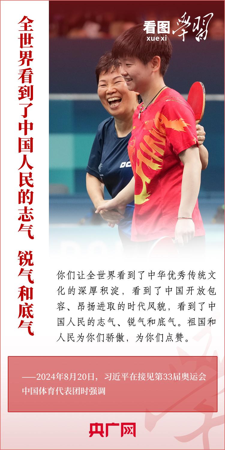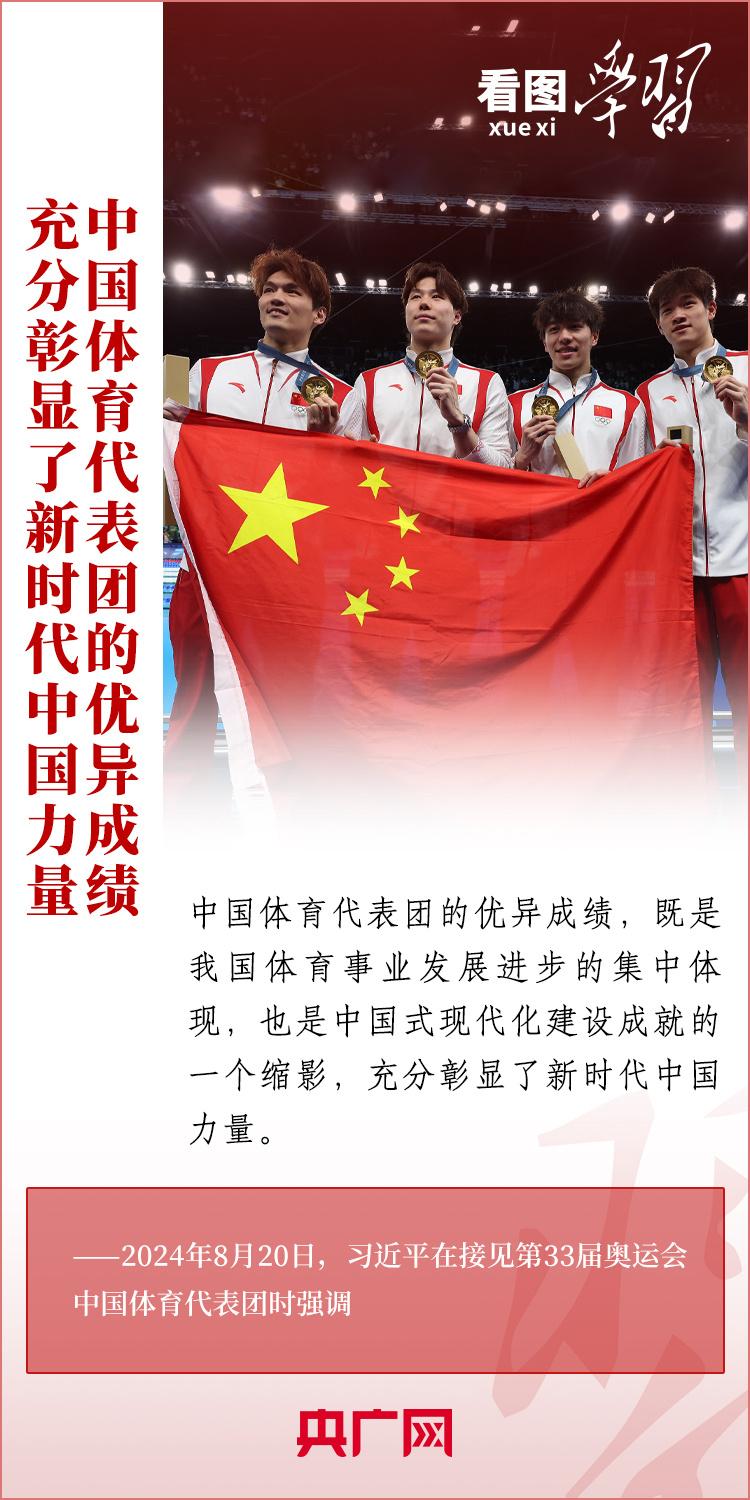 “祖国和人民为你们骄傲,为你们点赞。”8月20日,习近平总书记在人民大会堂接见第33届奥运会中国体育代表团并发表重要讲话。总书记高度肯定中国体育代表团取得的优异成绩,赞扬他们充分彰显了新时代中国力量、生动诠释了新时代中国精神、充分展现了新时代中国形象,勉励大家戒骄戒躁、再接再厉,为建设体育强国再立新功。一起来学习!