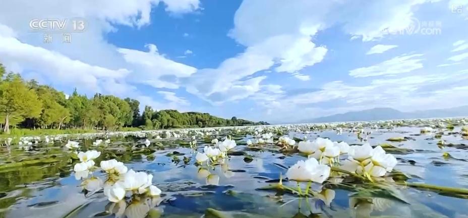 盛夏,云南大理洱海湖面,连片海菜花在水面绽放,吸引了大批游客前来打卡。