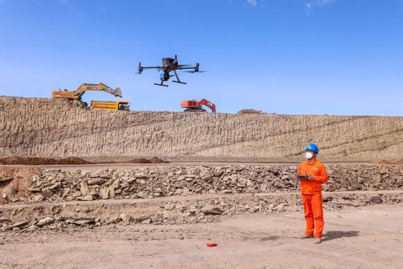 新疆准东宜化五彩湾一号露天煤矿,工作人员使用无人机对矿区进行测绘。张武军摄