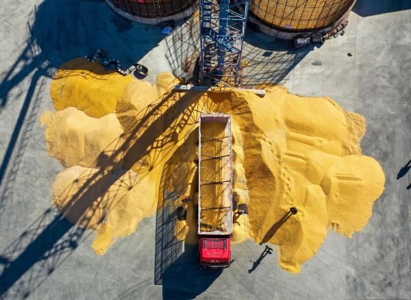 2023年10月15日,司机驾驶运粮车在内蒙古通辽市科尔沁左翼中旗腰林毛都镇收粮站卸粮(无人机照片)。