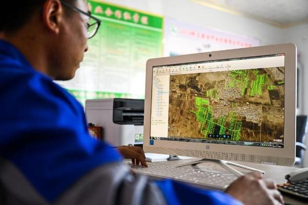 2023年4月12日,在内蒙古通辽市科尔沁左翼中旗腰林毛都镇,一家农业合作社的负责人查看耕种卫星地图。