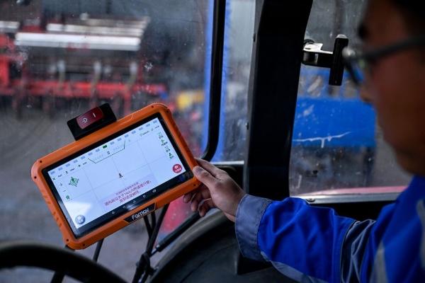 2024年3月13日,黑龙江北大荒(佳木斯)精准农业科技有限公司工作人员测试北斗自动驾驶仪产品。
