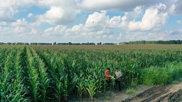 2024年8月8日,在吉林省梨树县孤家子镇两家子村,当地农业发展服务站高级农艺师兰雨壮(左)与四平市强盛农机农民专业合作社负责人查看玉米长势(无人机照片)。多年来,地处世界“黄金玉米带”的全国产粮大县吉林省梨树县,强化科技在农业生产中的支撑作用,持续提升粮食和重要农产品稳产保供能力。