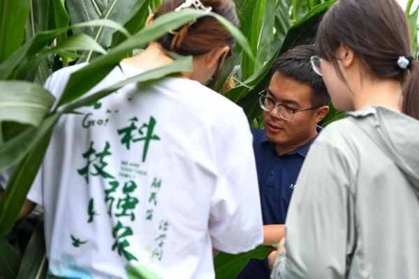 2024年7月25日,学生们在位于吉林省四平市梨树县四棵树乡三棵树村的“科技小院”查看试验田玉米长势。