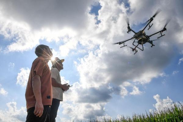 2024年8月8日,在吉林省梨树县孤家子镇,当地农业发展服务站高级农艺师兰雨壮(左)查看无人机作业情况。