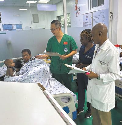 第二十七批中国援坦桑尼亚医疗队队员赵立健与坦方医务人员正在查房。格诺费娃摄