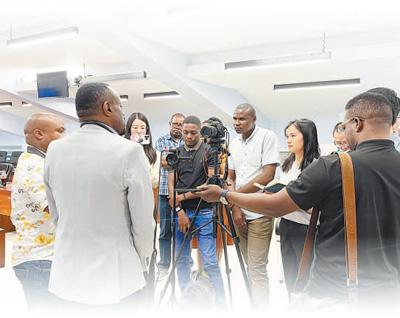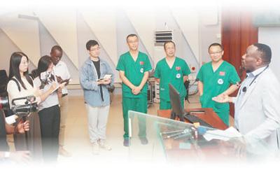 第二十七批中国援坦桑尼亚医疗队队员和当地医生向中坦媒体记者介绍相关情况。《每日新闻报》记者 穆罕默德·曼博摄