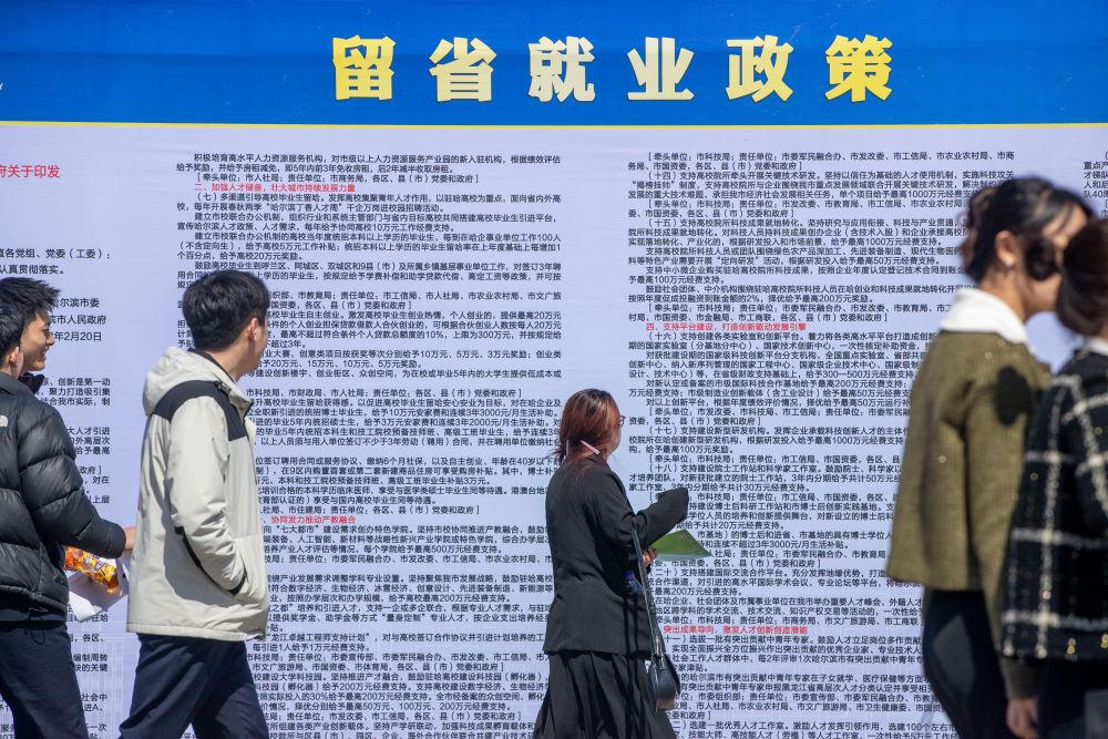 2024年4月9日,求职者在黑龙江省民办高校就业协作体2024届联合招聘会现场浏览留省就业政策。