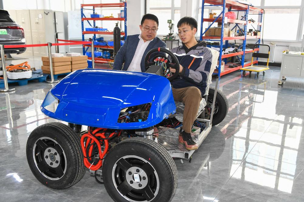 2024年3月13日,在吉林长春一家汽车科技企业,吉林大学汽车工程学院教授靳立强(左)试乘智能底盘样车。2023年,长春市科技局和吉林大学共建吉林大学概念验证中心,一手对接高校,一手对接企业,确保科研成果在技术路线和商业模式上的可行性,实现“从0到1”的转化。