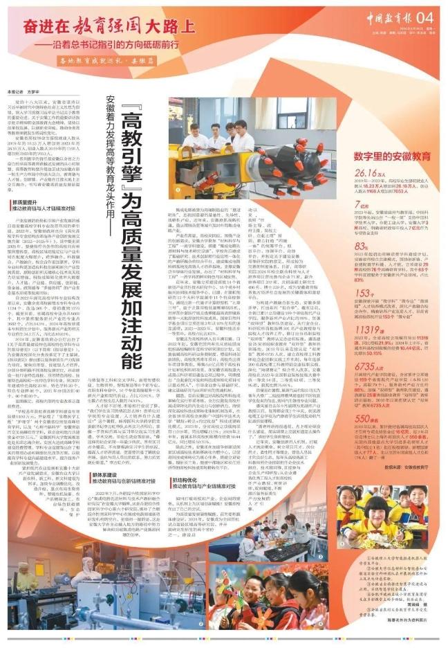 今天,“奋进在教育强国大路上——沿着总书记指引的方向砥砺前行”专栏之“各地教育成就巡礼”系列,通过一个视频、一组大图、一篇报道介绍安徽如何着力发挥高等教育龙头作用,为高质量发展加注动能——