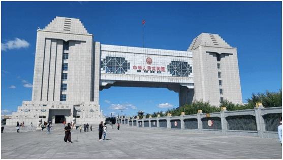 满洲里口岸于1902年建成,在现国门处先后建设了四代国门,如今的国门建筑面积5905平方米,总长105米,宽46.6米,高43.7米,是我国边境线上最大的国门,也是弘扬国威、展现国力的标志性建筑。