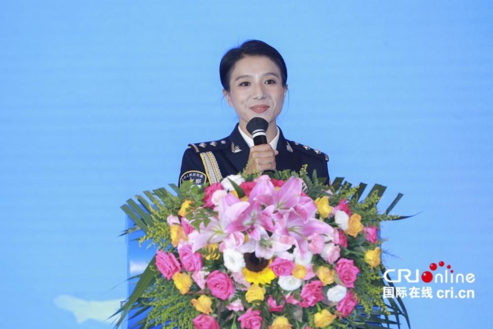 在8月22日举行的2024年“全国网络普法行·云南站”活动启动仪式现场,“茶城森警”主播茶姐、普洱市公安局思茅分局政工室三级警长李虹霏作分享。(主办方供图)
