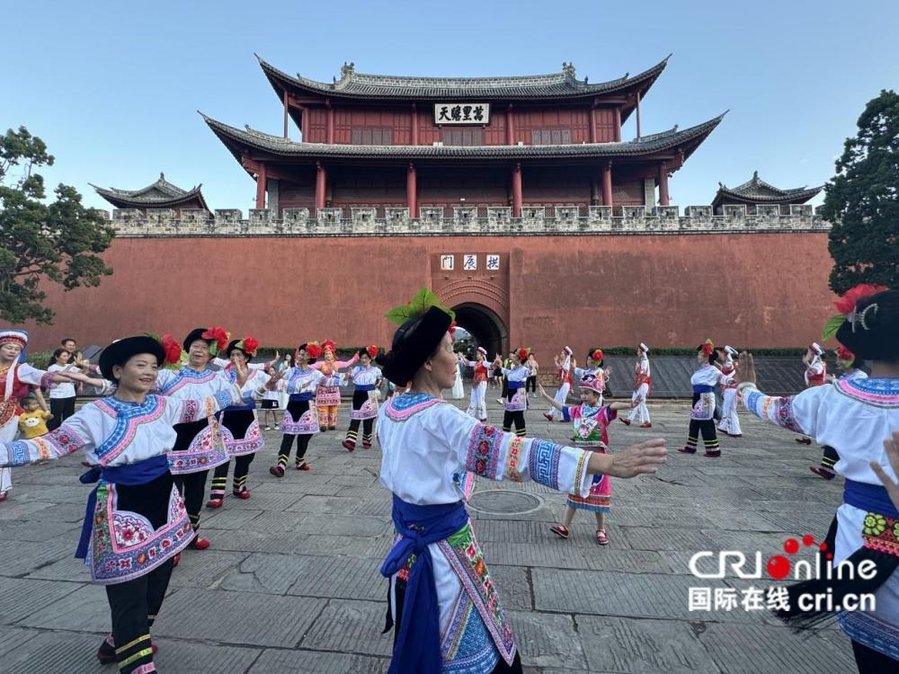 8月23日,融合了法律知识的白族霸王鞭、彝族打歌、快板等少数民族传统歌舞节目在云南省大理白族自治州巍山县拱辰楼广场上演,图为彝族打歌表演。(主办方供图)