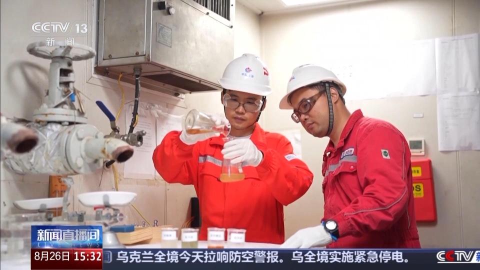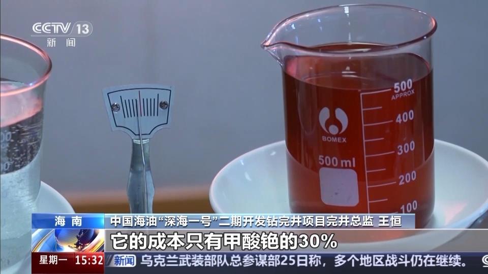 中国海油“深海一号”二期开发钻完井项目完井总监 王恒:“深海一号”二期这样的极限工况,以往国际上在完井液选择时只有甲酸铯一种选项,它的成本非常高昂,有着“液体黄金”之称。我们本次研发的高比重完井液能做到在低温条件下不结晶、高温高压条件下不分解,可以有效保护油气储层、保障作业安全,它的成本仅为甲酸铯的30%。